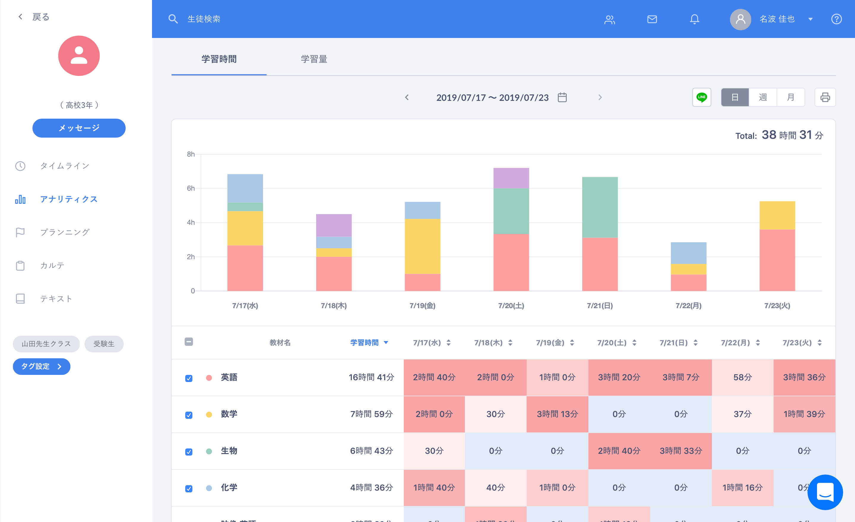 各生徒の自習室の利用状況や勉強時間、勉強内容を管理します。